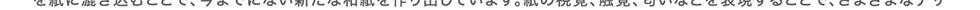 リサイクルできる素材を選んで新しい風合いの和紙を制作しています。日常生活で「ごみ」になってしまうような削りかす、廃材などを紙に漉き込むことで、今までにない新たな和紙を作り出しています。紙の視覚、触覚、匂いなどを表現することで、さまざまなデザインにおける紙の可能性を示すことができると考えます。